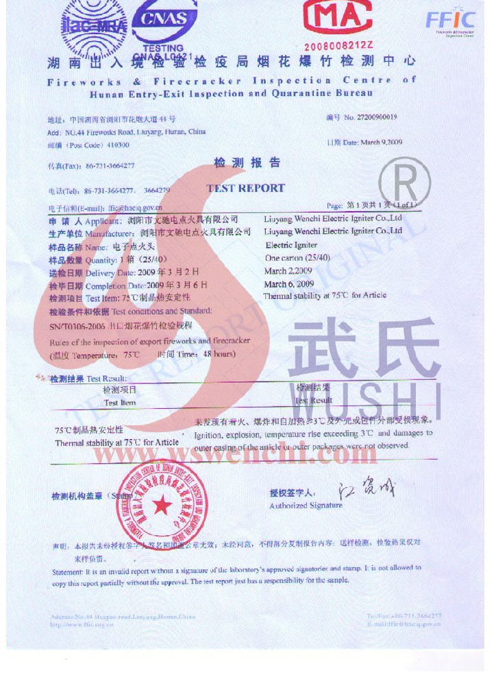 瀏陽市文馳電點火具有限公司(原培文電子點火器材廠),創建于1998年,是一家專業從事研制銷售電子點火產品的民營科技企業,是我國第1枚煙花用電點火頭生產者,是《煙花爆竹電點火頭國標》牽頭起草單位。公司位于中國“煙花之鄉”湖南省瀏陽市,地理位置優越,交通便利。 我公司研制的對象是用電能引燃火藥、做機械功等預定功能的一次性使用的元件或裝置,包括電點火頭(英文名ElectricMatch or Electric Igniter,中文俗稱“電火柴”或“電發火頭”)、電點火管和延期電點火管;我們估且在以后的產品技術欄中將我們研究的產品統稱為電點火具,將電點火器看成是用于提供和控制供給電點火元件點火的電能器材;我們研究的電點火橋路有橋絲式、無橋絲···